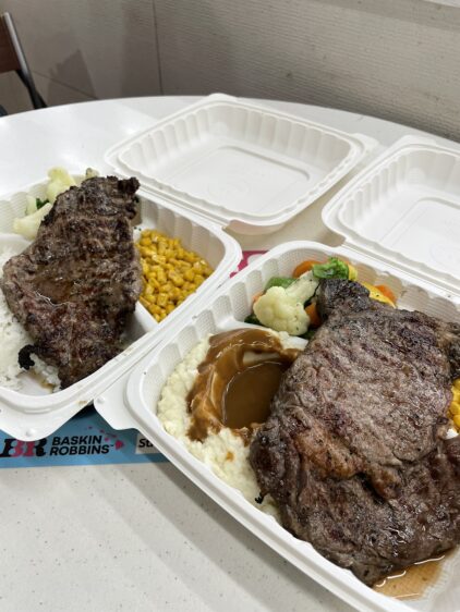 こちらは、適度な脂身があり、口に入れた瞬間、肉汁がじゅわっと広がるジューシーさが魅力です。プラスチックのナイフでもスッと切れるほどの柔らかさで、付け合わせのクリーミーなマッシュポテトと合わせると最高です!ステーキ好きならぜひ試してほしい一品です。
