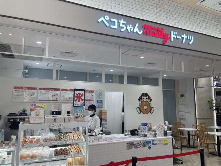お店は基本的にテイクアウトがメインですが、イートイン用の座席が約8席用意されています。ドーナツをすぐに食べたい時や、観光の合間にちょっと休憩したい時に便利です。店内は、ドーナツのショーケースはもちろん、可愛いペコちゃんのイラストやオブジェで飾られており、思わず写真を撮りたくなります。ドーナツのパッケージもペコちゃんデザインなので、手軽に写真映えするのも嬉しいですね!