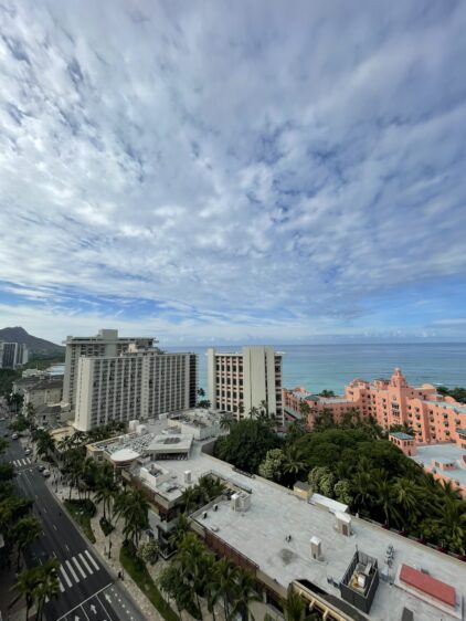 • ピンク色のロイヤルハワイアンホテルなどワイキキの街並み