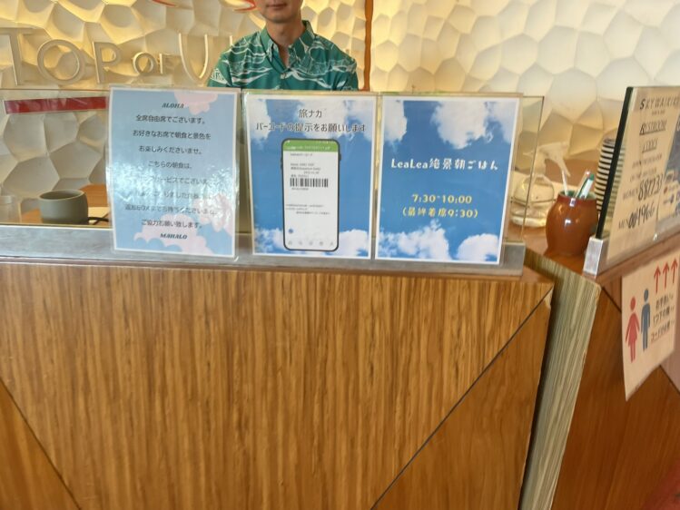 営業時間は 7:30〜10:00(最終案内 9:30)。この間に好きな時間に訪れることができます。受付では「LeaLea旅ナカアプリ」を提示するだけ。席は自由に選べるので、海側の景色の良い場所を狙うのがおすすめです。