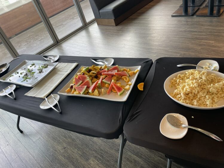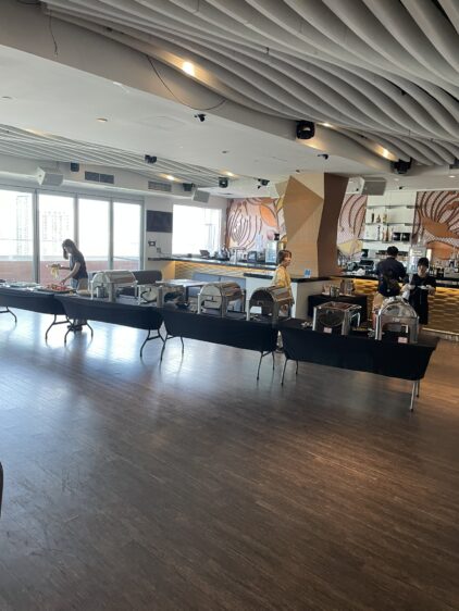 サラダ、パン、フライドライス、スクランブルエッグ、スパム、フルーツなど、バランスの良いラインナップです。卵料理やパンは補充の回転が速く、常に温かいものが提供されていました。