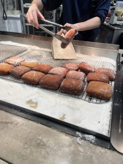 今回はノーマル(シュガー)をチョイス。常に温かく保たれていて、注文前にたっぷり砂糖をまぶしてくれます。