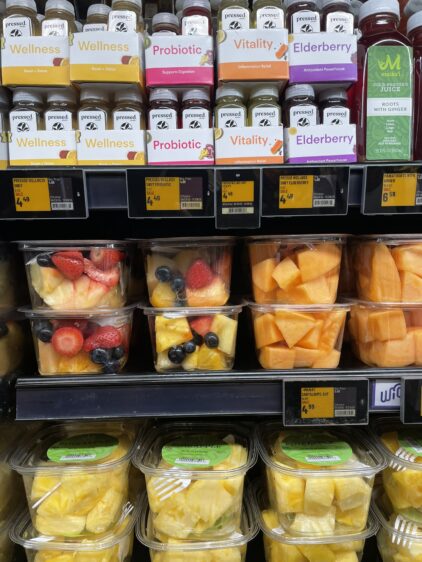 売場は「野菜/フルーツ」「惣菜・デリ(POKEコーナー含む)」「お菓子・スナック」「飲料」「お土産」に分かれており、日本のスーパーに近い感覚で使いやすいのが特徴です。
