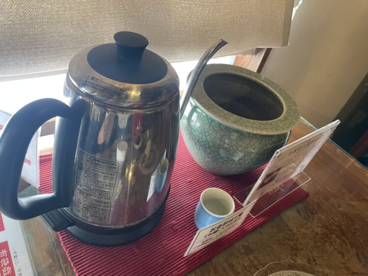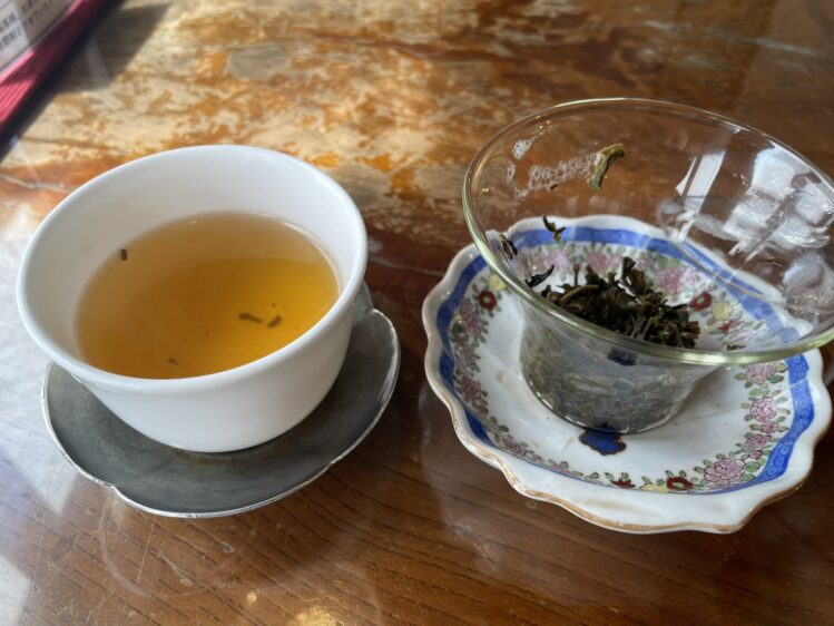 お茶はポットから自分で注ぐスタイル。最初はちょっと戸惑いましたが、スタッフさんが丁寧に教えてくれるので安心です。テーブルにある青い陶器は、茶葉が出すぎたお茶や残りを捨てるためのもの。自分のペースで何度も注ぎ足せるので、4〜5杯ほどゆっくりと楽しむことができました。