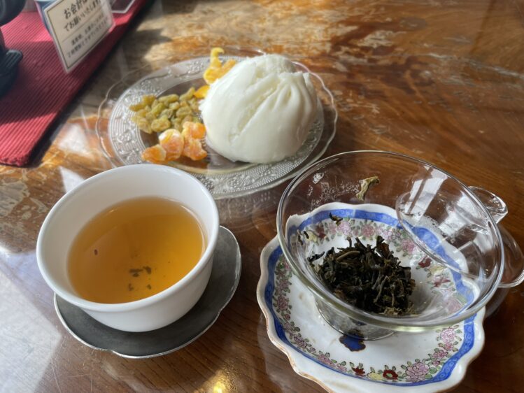 今回私は注文したのは「中国茶セット」のジャスミン茶(1,550円)です。セットにはチャーシューまん、ドライマンゴー、グリーンレーズン、ドライみかんが付いてきます。テーブルに運ばれてきたのは、可愛らしいティーポットと小さな湯飲み。ジャスミン茶の華やかな香りが、湯気とともにふわりと立ち上り一口飲むと、心が安らぐような優しい風味が口いっぱいに広がりました。