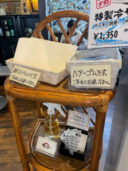 髪ゴムや紙エプロンの無料提供あり。