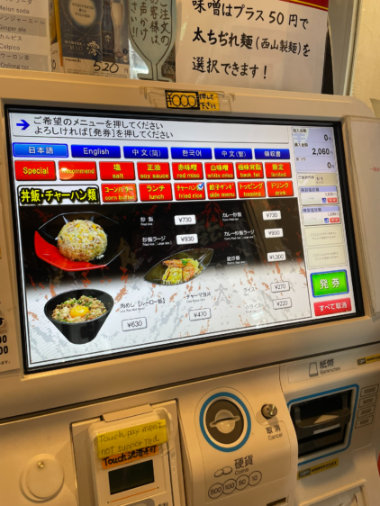 注文は入店前にタッチパネル式の券売機で行うスタイル。写真付きなので、サイドメニューやトッピングも選びやすいのが嬉しいポイントです。