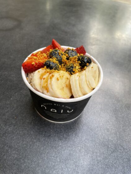 今回の注文したのは、Naiuの人気No.1メニュー「ナルボウル(Nalu Bowl)」。ベースのアサイーは、氷っぽさがなくしっかりとした “もったり感” があり、グラノーラの香ばしさとアサイーの爽やかな酸味、そして新鮮なフルーツの甘みが絶妙なバランス。