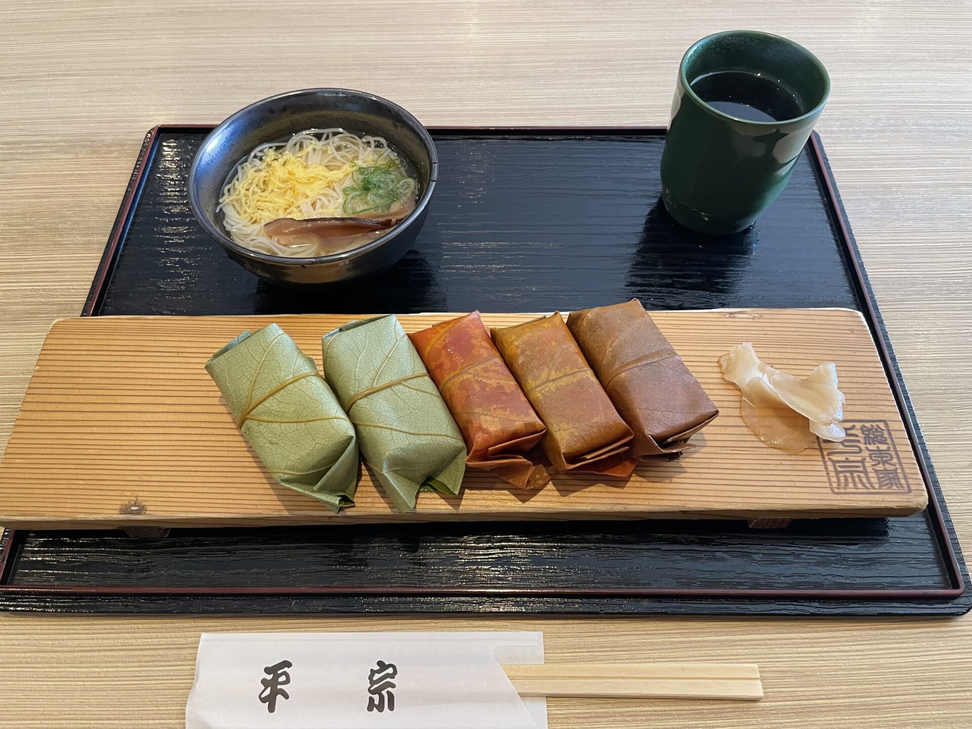 2 pieces of kakinoha-zushi + simmered noodles — good for a snack or for children.