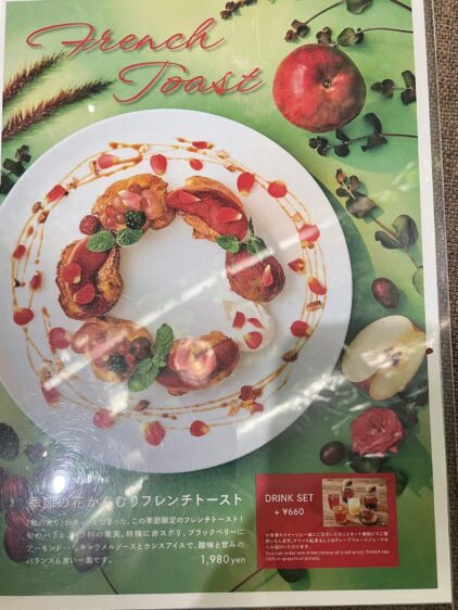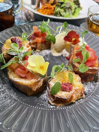 The café rotates the “flower crown” French toast by season (e.g. autumn might have roses, apple, caramel and cassis ice cream).